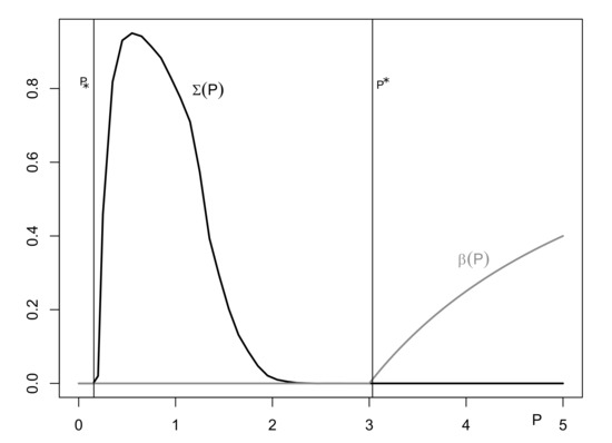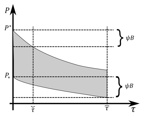 In the following, we need to use the correct boundaries in the integral defining (until now, we simply said that g becomes zero if the argument is outside ). For a given P, we compute the -value, where the upper (lower) boundary of hits . For the upper bound, we have
