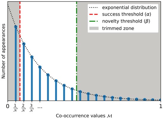 To identify a suitable procedure to select the two thresholds, we analyzed the probability distribution of the values within the considered statistically significant document corpus of size . We found that the terms co-occurrence values have two important properties: (i) considering the way they are computed, may take only particular values inside interval, namely multiples of ; (ii) their distribution is heavily skewed to zero, with no negative values and few observations deviating far from zero. Thus, we can model the distribution of the term co-occurrences as an exponential-like distribution, where and act as two thresholds producing a two-sided trimmed exponential distribution (Figure 1). Neglecting the null values of , we may select and such that each of the thresholds filters out approximately 10–30% of the values, a practical selection being and , with and being the first and third quartiles.