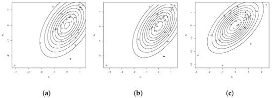 For the joint pdf given in (2), we use the notation , where is the correlation coefficient. The bivariate distribution is obtained from the vector transformation , where