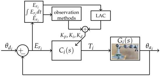 Figure 2 shows the block diagram of the PID closed-loop control system, in which the parameters of the controller are tuned by a combination of observation methods and LAC based on the steady-state error. The process of observation methods is carried out by the mathematical model of the robotic arm and LAC is the real-time tuner of the controller.