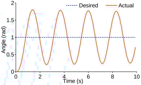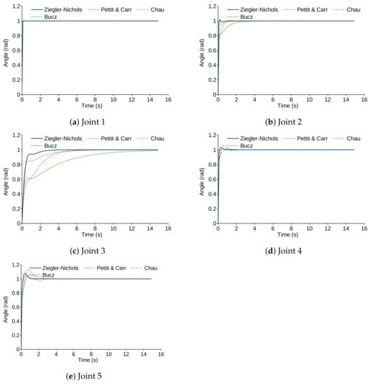 PID control has been used by many researchers to move the joints’ trajectory in the robotic arm, because of its potential in providing acceptable results and ease of operation [,]. The input and output of the control system are the desired and actual trajectory angle of each joint, respectively. In this paper, the PID controller’s parameters are determined by stability analysis and initialised by observation tuning methods, i.e., Ziegler–Nichols (Z-N), Pettit & Carr, Chau, and Bucz [,].