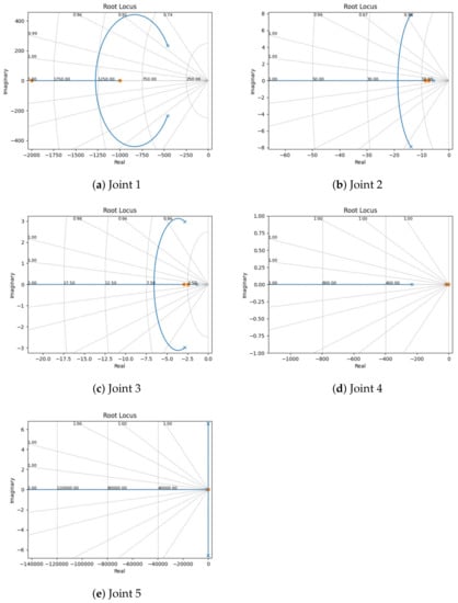 In Table 4, it can be observed that the AE and ST for Z-N show lower values in all joints. In addition, each joint followed the desired trajectory, with lower overshoot by the tuned Z-N parameters than other methods. For example, the AE for Z-N is 6.6%, 83%, and 53% lower than the AE for Pettit & Carr, Chau, and Bucz. Therefore, parameters Z-N are selected for the initialization of LAC due to its lowest AE and ST. To monitor the stability of the closed-loop control system tuned by Z-N, the root locus method is analysed for each joint based on the mathematical models and tuned controller. Figure 5 represents the root locus graph for the PID close-loop control system tuned for each joint.