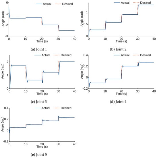 The ultimate gains, , for joints 1 to 5, are 1, 44.5, 7, 66, and 25, respectively. Similarly, is 0.003, 0.5, 1.5, 0.3, and 0.6 for joint 1 to 5, respectively. Table 3 illustrates the PID parameters tuned for each joint.