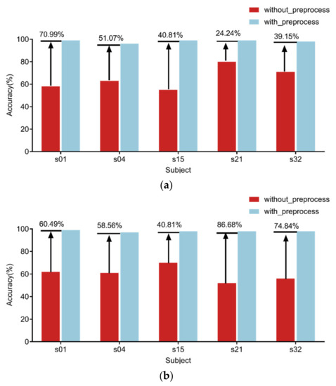 Comparison of accuracy on Arousal (a) and Valence (b) before and after baseline preprocessing.