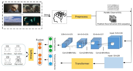 To address the aforementioned issues, the study offers an EEG emotion identification model based on the parallel transformer and 3D-CNN spatiotemporal feature fusion. The parallel channel EEG map and position reconstructed EEG sequence are created first. Then, the model transformer [33] and 3D-CNN are employed to extract the respective temporal and spatial information. Finally, the simultaneously extracted spatial and temporal features are connected to a joint feature vector, and the Softmax layer receives it as input to predict emotion.
