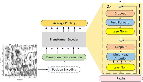 This module primarily extracts EEG temporal information, hence EEG parallel channel maps that have been preprocessed serve as input. Considering that the creation of emotions in the brain is a continuous and full process in time, getting the contextual characteristics of EEG is crucial for emotion detection. We used the Transformer to construct a model to extract the temporal characteristics of EEG because the attention mechanism can efficiently perceive the contextual relationships of the signal. The particular procedure is depicted in Figure 7.