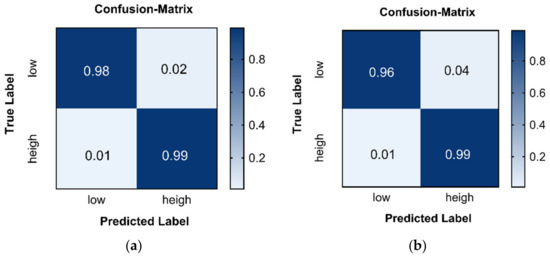 Figure 9 depicts the confusion matrices for the arousal and valence labels. According to the data, the TSFFN has a greater recognition rate for intense emotional states. In the task of label arousal identification, the predictive accuracy of the model for high and low emotions is 99 and 98 percent, respectively. The model also achieves 99 percent accuracy in valence recognition for high emotional states and 96 percent accuracy for low emotional states.