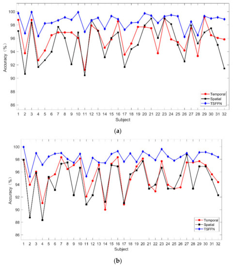 The ablation experiments are carried out to verify the validity of each module of the TSFFN. Ablation variables include the temporal feature extraction module (temporal) and the spatial feature extraction module (spatial). Calculate the accuracy of each model’s arousal and valence label prediction according to Figure 10.