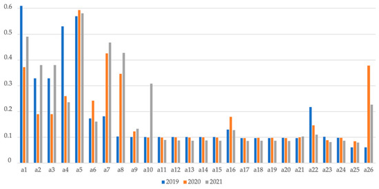 The DM involved in the construction process of the P-AHP method is the quality manager (QM). The QM is responsible for the engine control process and the errors that occur in it. In addition, the QM defines the evaluation that we will use in our analysis. As also specified in the methods section, we have considered that the matrices are refreshed every year. This choice is determined by the real needs of the company, that presents the overview of errors that have occurred in the company every year in company audits and the plan to correct and reduce them. In Table 1, we report the evaluation for 2019, 2020 and 2021. We identified a set of 26 errors (our alternatives ) for the three years considered.