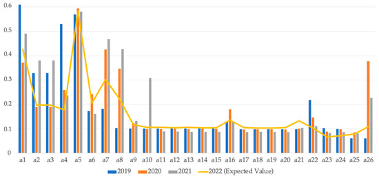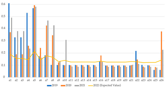 We used Formula (3) for each scenario generated to verify how the ranking of the alternative’s changes at based on the ranking feedback provided in the past. Figure 3 shows the updated rankings of alternatives defined with an integrated dynamic—prospective approach. Note that the alternatives undergo several changes in the position of the final ranking (see for example, the alternatives and ).