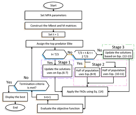 - Step 1: Generally, the H-MPA starts with a set of random solutions as shown in Equation (15):where denote the upper and lower limits, respectively. For TDM, the d = 9.