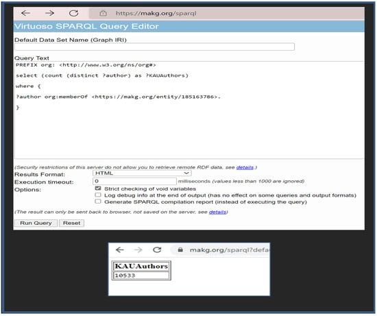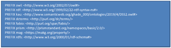 - Evaluation: KAULD is evaluated to retrieve the new data. This task is performed using a federated SPARQL query that includes the ‘SERVICE’ statement, because of the need to send a query to a remote site (MAKG endpoint). The prefixes in Figure 8 are used every time KAULD is queried.