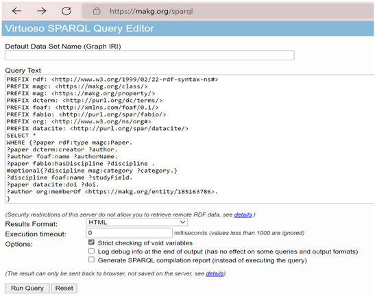 - Databases and logic programming (DBLP): DBLP is a bibliography that specializes in the computer science area. It contains the metadata of publications, authors, journals, and conference proceedings series. The dataset is available in RDF format to be freely reused at (https://dblp.org/rdf/) (accessed on 20 May 2022). The size of the March 2022 release of the DBLP dataset is over 252,573,199 RDF triples and 6,010,605 publications written by 2,941,316 authors. The developers are planning to develop a SPARQL endpoint to query the dataset easily.