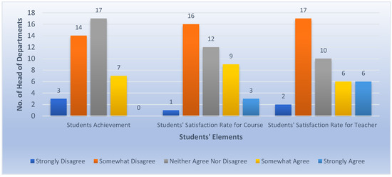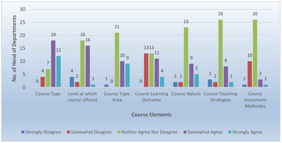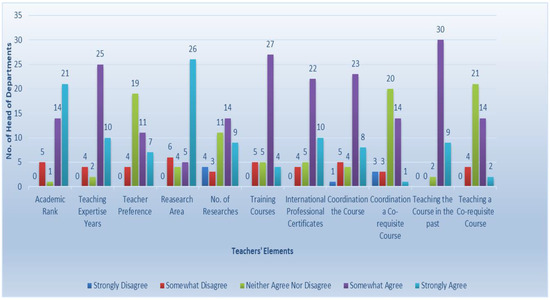 According to the testing of the academic profile elements (summarized in Figure 10), the survey depicts the impact of a teacher having taught the course before. The majority of participants believe it is a significant factor in deciding course–teacher distribution. No participant gave a vote against it. In addition, it proves that the research area of the academic teacher is seriously a considerable element that controls the decision, as more than 60% of the votes strongly support it. The academic rank was considered by more than half of the participants. This element can be used to set the teachers’ priority, when more than one teacher is allocated to teach a specific course. Furthermore, the survey indicated the importance of the certificates the academic teachers have in the course–teacher assignment. For a teacher to be the course coordinator, the result shows how essential it is, since 20% strongly believe, and 56% support it, since course coordination plays a significant role in course distribution, while only 12% of people disagree with it. Regarding these results, the affective teacher elements were teaching the course before, the research area of the academic staff, and coordinating the course.
