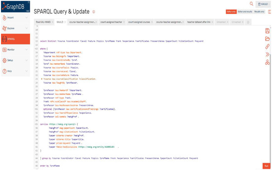 The query in Figure 15 counts the numbers of courses assigned to the most proper teachers in the possible matching, between the courses and academic teachers in this study. The query retrieves the courses from the KAULD dataset regarding the most effective elements mentioned in Section 5.1.