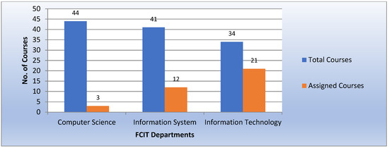 As illustrated in Figure 16, more than 81% of Computer Science courses are assigned to teachers, with less than 20% remaining unassigned. It is also stated that teachers are assigned to around 83% of the courses in the Information System department. On the other hand, teachers in the Information Technology department are assigned to 68% of the courses. This result demonstrates that most of the courses matched the best academic references regarding their elements.