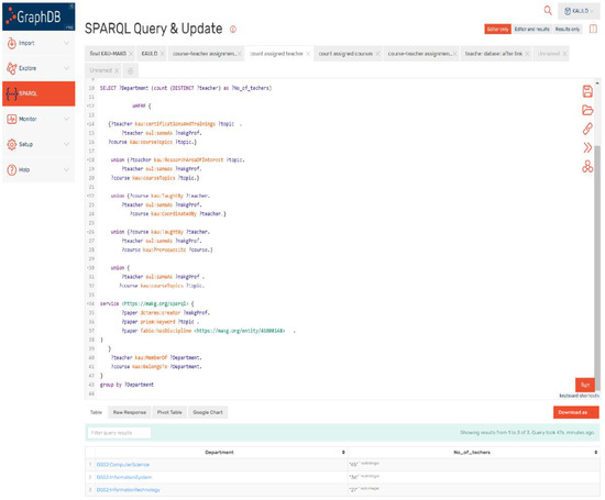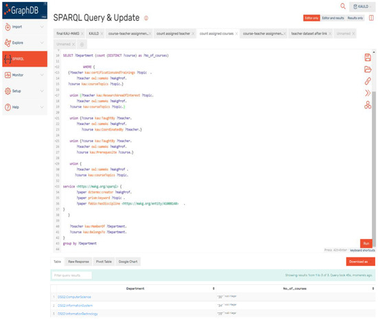 The query in Figure 17 counts the number of academic teachers from each department that are qualified to teach courses related to their qualifications in this study. The query matches the teachers with the related courses from the KAULD dataset, regarding the most effective elements mentioned in Section 5.1.