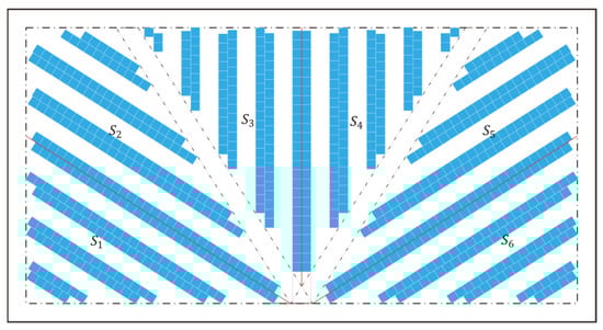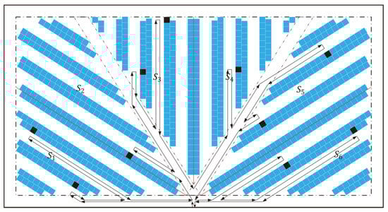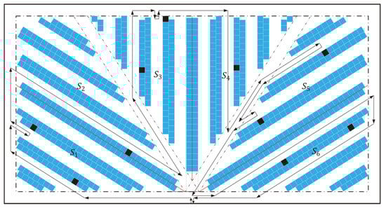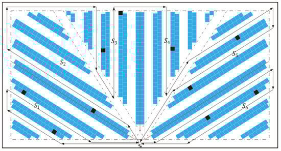 As the specific parameter settings in a warehouse picking system can have varying degrees of influence on the picking routing, the parameter settings for the leaf storage layout design are a prerequisite for the study of routing optimization under this layout. When the shelf angle of the lower right area in the leaf layout is approximately 32.33° (corresponding to the lower left area of 147.67°), and the angle of the right diagonal cross-aisle is 57.67° (corresponding to the angle of the left diagonal cross-aisle of 122.33°), the picking efficiency is the best in the picking operation, according to Öztürkoğlu et al. [17]. Therefore, the routing strategy of the picking operation in leaf layout is studied under the above parameter settings.
