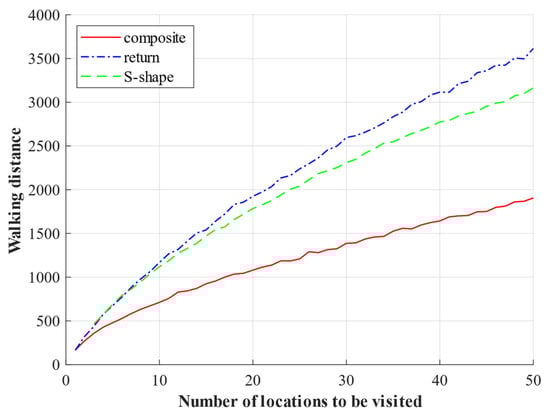 The existing routing strategies mainly include the S-shape strategy, the return strategy, the midpoint strategy, the largest gap strategy, the composite strategy, and the optimal routing strategy [22,28,51,52]. Dijkstra et al. [53] comprehensively considered the picking routing problem and location allocation problem in the warehouse picking system, established the expected walking distance model of four routing strategies (the S-shape strategy, the return strategy, the midpoint strategy, and the largest gap strategy) under any location allocation strategy, and the expected picking walking distance model after dynamic planning of location allocation and made a comparative analysis. Using a dynamic programming algorithm to optimize the location allocation strategy, the picking walking distance is better than that under the four routing strategies. Rao et al. [54] designed an accurate analysis model to calculate the walking distance of the S-shape strategy based on the class-based storage strategy, and the accuracy was verified to be within 2%. Zhu et al. [55] improved the additional distance of the S-shape strategy order stochastic model based on class-based storage, which provides a reference for further optimizing the walking route of the picking operation.