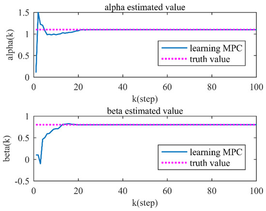 Although the learning effect is evident when the system parameters are constant, it does not illustrate the algorithm’s capability to reduce the uncertainty in the future. When the model parameter variance changes, that is, , the model parameters and take different values at every step, meaning that and . Recall that in (34) is the learning factor. When , the control input in the system does not have any learning effect. In other words, in such a non-learning MPC, the uncertainty information is not utilized to reduce the system’s future uncertainty. The values and were used in the simulation, then the parameter estimation processes under these two learning factors were compared.