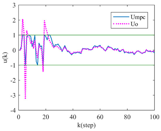 The optimal control sequence obtained with known parameters and no control constraints was compared with the MPC control sequence with learning characteristics as well. As shown in Figure 4, the MPC control sequence with learning characteristics is consistently better than the optimal control with known parameters before the system is identified. This result is due to the controller pursuing the control goal while learning the unknown parameters in the control process. After identifying the system’s real parameters, the MPC with learning characteristics closely tracks the optimal control with known parameters.