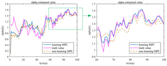 Figure 5 and Figure 6 show the estimation of parameters and during the control period, which includes the true and values, the non-learning MPC estimation process at , and the learning MPC estimation process at . It can be seen that the parameters obtained via the proposed MPC estimation with learning ability are closer to the ground truth when compared to the non-learning MPC’s parameter estimation process. Because the actual parameters in the model vary in time, even though the effect is obvious without learning constant parameters it can be seen that the error between the estimated value and the true value is decreasing. Therefore, the learned parameters become progressively more accurate, demonstrating that the algorithm effectively reduces the future uncertainty of the system.