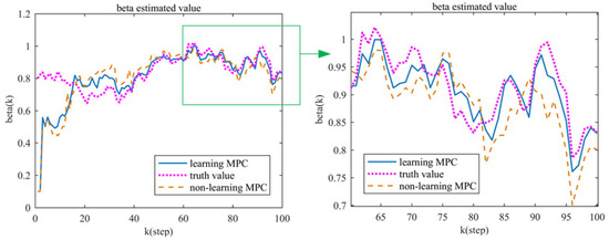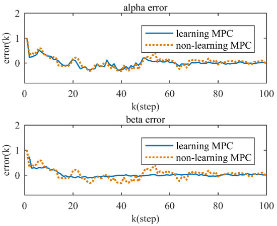 Comparing the errors in the estimation process of the learning and non-learning MPCs, shown in Figure 7, it can be seen that the estimation error value of the learning MPC is near 0 and almost coincides with 0, while the error value of the non-learning MPC is always greater than that of the learning MPC.