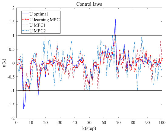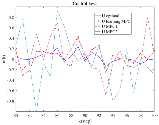 To illustrate the improvement in system performance, we compare the control laws with a traditional adaptive MPC. Figure 8 and Figure 9 show the comparison between the optimal control law (obtained when all model parameters are known and there is no control constraint), the learning control law (obtained when the parameters are unknown and the control constraint is within the [−1, 1] range), the MPC1 control law (obtained with the algorithm in [10]) and the MPC2 control law (obtained with the algorithm in [16]). Because the system’s unknown parameters vary in time, the system needs to learn the unknown parameters at each time, and the control law does not reach a stable state. Furthermore, in addition to the control objectives, the dual controller needs to learn the unknown parameters. Consequently, the learning MPC control law is always greater than the optimal control law. However, when the parameter error gradually decreases in the later stage, the dual control law becomes closer to the optimal control law. Thus, when the system has uncertainty and the control algorithm with learning ability is used, the system runs in an approximately optimal manner. It can be seen from the figure that the method proposed in this paper is closer to the ideal control laws when the parameters are known, reflecting the superiority of the method as compared with the MPC1 and MPC2 control laws.