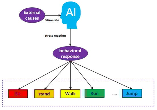 Human behavior was first discovered and defined by Alfred Espinas in 1890 []. With the change and development of science and technology, the study of human behavior has gradually become an effective entry point for researchers to understand human emotions. Through literature survey, it is found that the appearance of human behavioral characteristics comes from the subjective reflection of people through the cerebral cortex after receiving external stimuli, as well as the characteristics of facial and limb behaviors []. Common human behaviors include sitting, standing, walking, running, jumping, laughing, and crying. The performance of every human behavior stems from changes in human emotions. In the early research process, the research contribution of researchers is to provide favorable characteristic types and research directions for ethology research, from the definition of human behavior to the classification and summary of human behavior. In real life, people experience negative mood swings due to external influences from family, study, and work. When negative mood swings reach a certain level, they cannot be dealt with correctly and ultimately manifest as excessive risky behavior. Human and economic losses. As our researchers, we can timely understand the psychological state of the target through effective means, detect problems in time and take appropriate control measures to reduce negative hidden dangers [], which is the problem we need to solve in our current research. Figure 1 illustrates the classification of human behavior proposed by researchers [,].