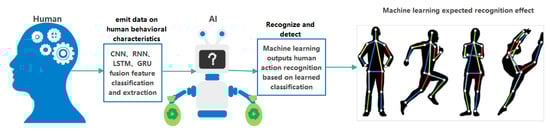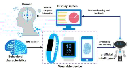 In recent years, with the development of Industry 4.0 technology, human–computer interaction technology has been increasingly favored by researchers in the field of machine learning. Human–computer interaction is abbreviated as HCI []. The principle and process are data transmission through artificial intelligence machine learning through emotional factors expressed by humans, and finally, the detection results are fed back by smart devices. Researchers need to implement the process of human–computer interactions and machine learning of human limb features through corresponding algorithms []. At present, human action recognition (HAR) has become the main means for researchers to obtain target behaviors. Throughout the previous literature, HAR technology originated in the fields of international military, anti-terrorism, and national security. After determining the behavior of the person involved, carry out the necessary work. Since the 21st century, HAR technology has gradually been widely used in the fields of medical treatment, monitoring, detection, and work assistance. In the field of health care, medical patients can choose to seek medical treatment in the hospital or at home according to their own conditions []. The emergence of HAR technology can also directly respond to the signals in the patient’s body in the monitoring system through transmission, allowing doctors to understand the patient’s situation in time. In addition, in the elderly population, HAR technology can also perform real-time data detection on the elderly population, and the guardian can realize the remote care of the physical and mental conditions of the elderly in different places so as to avoid the occurrence of dangerous behaviors. Combining the above, we need a set of scientific detection mechanisms and research methods to effectively capture the behaviors exhibited by humans. The need to effectively understand humans and conduct behavioral research requires access to human emotional factors. Thus, what equipment do we need to capture human emotional traits? Figure 2 is an idealized schematic diagram of human–computer interaction given by researchers []. As can be seen from Figure 2, in the process of data interaction between human behaviors in the human–computer interaction mode, a sensor is required to receive human body data and transmit it to an artificial intelligence device for data recognition and analysis. The final research output of this paper is the accurate detection of human behavior based on wearable technology. In the following chapters of this article, we will describe how to conduct experiments with wearable sensors through the analysis and use of human behavioral algorithms and the process of improvement.