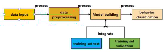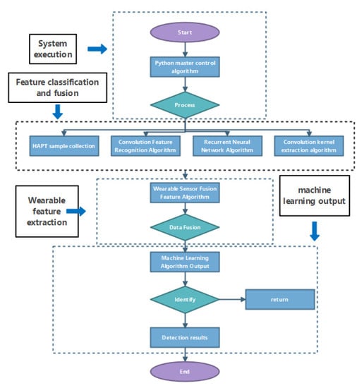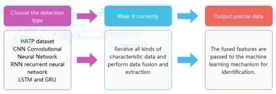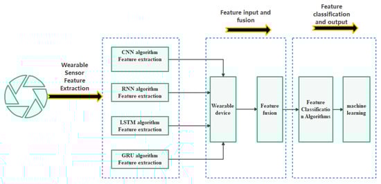 Wearable devices discover the feature expression of raw sensor data through deep learning. In the implementation process, we need our researchers to extract features to achieve the best results []. In recent years, the main algorithms used in wearable sensors in human behavior research include restricted Boltzmann machine RBM, deep autoencoder DA, sparse coding SC, convolutional neural network (CNN used earlier), and recurrent neural network RNN []. At present, these algorithms constitute the most important algorithms for the acquisition of human behavioral characteristics in wearable media []. This paper will acquire human behavior characteristic data based on the acceleration sensor. According to the previous survey, the data are preprocessed to each categorical feature extraction device, and each module has different working characteristics. In the next work, we will make corresponding improvements in complex behavior detection, data collection, and feature extraction and use wearable media sensors to receive HATP sample sets, CNN deep convolutional neural networks, RNN recurrent neural networks, LSTM and Gated recurrent unit GRU algorithm, which fuses data features and transmits them to machine learning equipment for detection to obtain human behavior features. Figure 3 flow chart is a model diagram of the working process of the wearable sensor [].