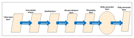In the algorithm output of this process, the true value and false value in the python output process are used to judge and return the result. Further, 1/N is the average number of the region where the extracted two-dimensional convolution result is located in the pooling layer, starting from the two initial values of (i − 1) and (j −1), and n is the corresponding pooling layer finally obtained. The upper bound of the weighted sum when the result is true. The product of 1/N and is the final value of . Figure 10 below [] shows the full process model diagram of a deep convolutional neural network.