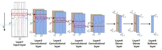From the above figure, we can see that the total dimension and recursive layer are 8 sets of eigenvalues. The features in the model are transmitted in sequence according to the principle of time series []. Additionally, there are multiple channels for a single feature in each model. The content in the model diagram is the input data from the sensor from left to right. The first layer in the picture is the input data value of the receiving sensor device, the 2–5 layer is the convolution layer data, and the 6–7 layer is the nonlinear layer. The relationship incentive layer, the last eighth layer, is the classification result of the acquired behavior data []. The positioning in the model diagram is that the layer layer represents the data range D × S1, where D represents the number of channels of the data, and SI represents the data length of the first layer at this time. Layers 2–5 are convolutional layers, K I is the convolution kernel in the first layer, FI is the number of features in the first layer [], and a, i, I are the feature map excitation of the first layer. The last layer 6, and layer 7 are hidden recursive layers. a, t, I, I represent the excitation data from layer i to layer I at time t in a given time series.