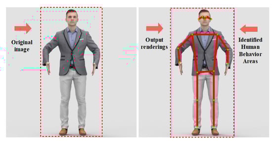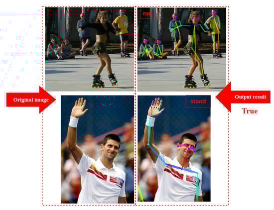 In this paper, two sets of human behavior features are used for detection in the detection results [] of Figure 27 above. The left side is the original image, and the right side is the detected result. Compared with the actual situation, the mechanism completes the detection of the target under the improved algorithm. The human behaviors in the two sets of pictures are “running” and “standing” []. The mechanism detection output after machine learning is consistent with the actual situation, and the detection is successful.