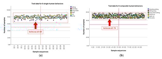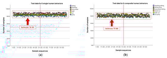 By re-improving the algorithm, this paper realizes the detection of human behavior characteristics under the wearable sensor by the current detection mechanism under machine learning []. By comparing the previous data with Figure 28 [], the mechanism of the improved algorithm after machine learning has been greatly improved compared to the behavioral feature recognition of the target before the improvement. At present, under the new machine learning algorithm, the average detection rate of a single behavior feature is about 85%, and the detection rate of a compound behavior feature is about 82.5%. The significant improvement compared to before the improvement. Table 9 presents the final detection data under the new algorithm.