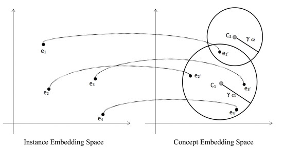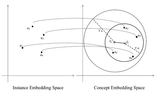 can address the issue that multiple concepts corresponding to the same instance would gather closely in the embedding space. The embedding e of the instance i that belongs to c, after being mapped, should lie in the hypersphere neighboring range with the sphere center point o and radius . In other words, after training, e will be around the o rather than overlapping with point o.
