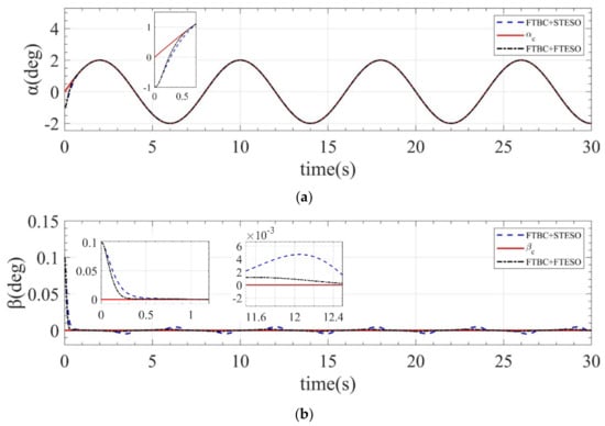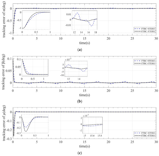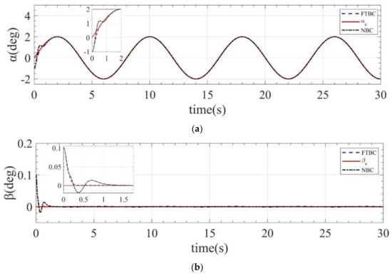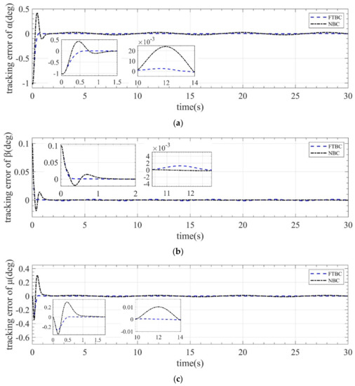 The comparison data of the attitude angle tracking performance and tracking error are shown in Figure 10 and Figure 11, respectively, and Table 4. The convergence rate and tracking precision of the FTBC controller are higher than those of the NBC controller, as shown in Table 4.