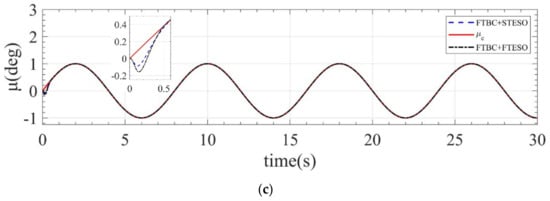 The different tracking performances between the two controllers should also be discussed. The main reason for the difference in the tracking precision is that the estimation errors of the differentiators , were introduced into the tracking errors and . In the process of designing the FTBC scheme, we avoided this problem as described in Remark 2. Moreover, there are two main reasons for the difference in the tracking speed. First, when the absolute tracking errors are greater than one, the FTBC owns a faster convergence rate than NBC because of its power term . Second, the performance of the observer will also influence the settling time of the whole system. This will be discussed in detail later.