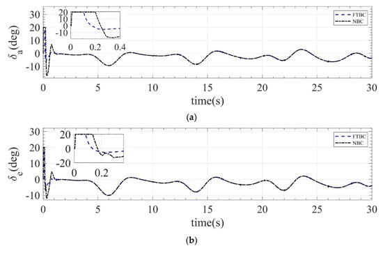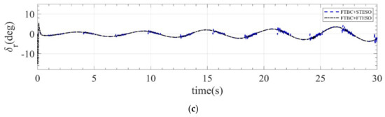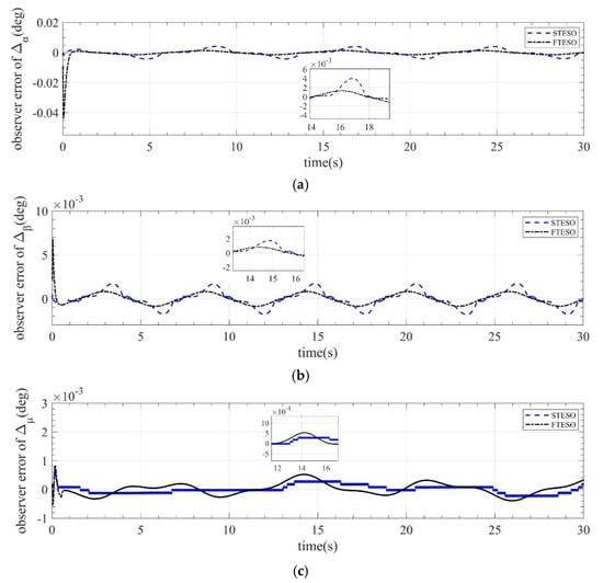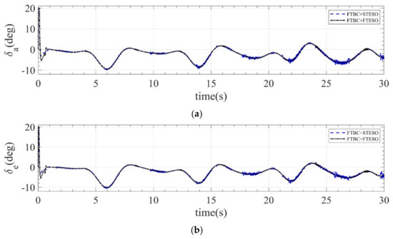 Figure 14 shows the deflection angles of the three actuators, and it was observed that the initial saturation time values of the three actuators when using the FTBC were much lower than those for the NBC. The initial saturation makes the control commands unable to be responded to in time, thus increasing the settling time of the system, as shown in Figure 11 and Figure 13. Moreover, in the process of designing the SMDO, we found that the main reason for the initial saturation is that the initial estimation errors of SMDO were much larger than those of the FTESO. The SMDO was essentially identical to the fixed-time, non-recursive HOSM differentiator [31]. These disturbance observers always have large observer gains and overshoot. Users have to reduce the gains of SMDO and controllers to avoid long initial saturation. This demonstrates the superiority of the FTESO proposed in this study.