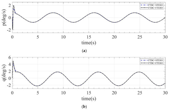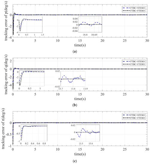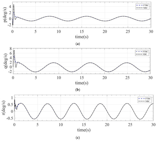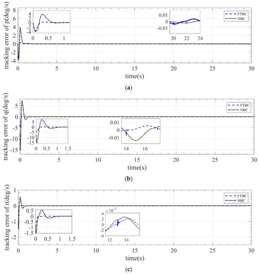 The comparison data of the angular rate tracking performance and tracking error are shown in Figure 12 and Figure 13, respectively, and Table 5. The convergence rate and tracking precision of the FTBC controller are higher than those of the NBC controller, as shown in Table 5.