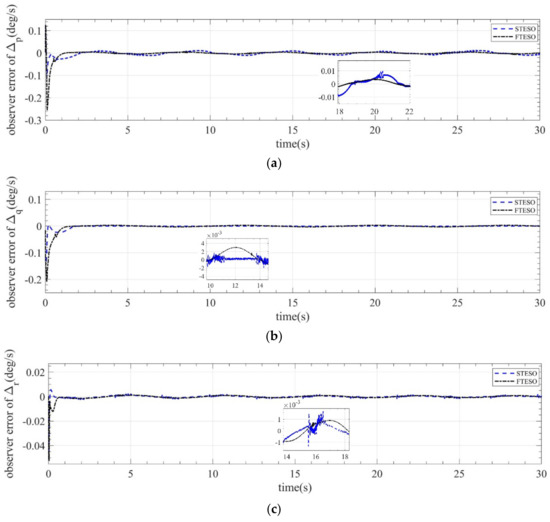 The simulation results are shown in Figure 3, Figure 4, Figure 5, Figure 6, Figure 7, Figure 8 and Figure 9. It is seen clearly that the FTESO achieves higher accuracy and smoother output than the STESO. The comparison data of the estimate accuracy of FTESO and STESO are shown in Table 2. In the process of studying the STESO, we found that the super twisting algorithm has robust stability, but its output is not smooth. Increasing the gains of the super twisting algorithm leads to higher convergence accuracy and more oscillatory output. Simulations show that the output of FTESO is smoother than that of STESO when their convergence accuracy is similar. That demonstrates the superiority of the FTESO proposed in this study.
