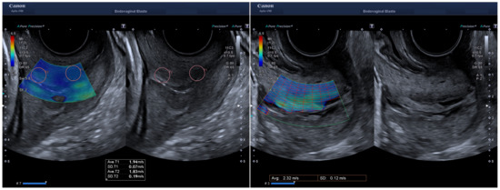 - Fruscalzo, A.; Steinhard, J.; Londero, A.P.; Frohlich, C.; Bijnens, B.; Klockenbusch, W.; Schmitz, R. Reliability of quantitative elastography of the uterine cervix in at - Term pregnancies. J. Perinat. Med. 2013, 41, 421–427. [Google Scholar] [CrossRef]