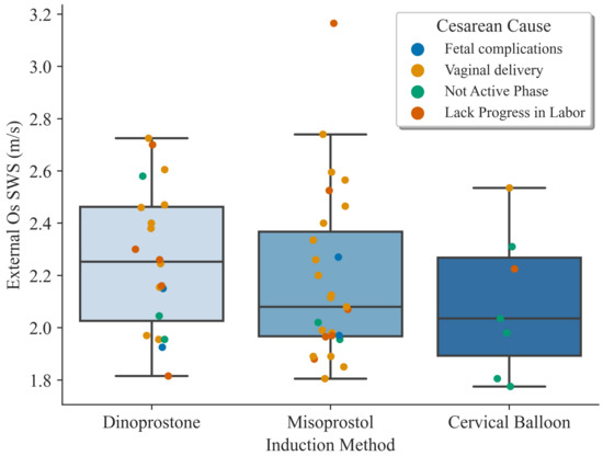 Boxplots showing the shear wave speed results on the external os dividing the groups by induction treatment. The colored dots indicate the reason for the Cesarean section or if it was a vaginal delivery.