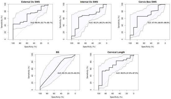 In addition, the ROC curve was analyzed in Figure 3 to explore the effectiveness of each method to predict induction success. The AUC for SWS was 68.9%, 65.2% and, 67.2% for external os, internal os and, cervix box, respectively, and 69.5% for CL and 62.2% for BS. The ability of elastography in the external os and CL to classify successful inductions obtained the highest values.
