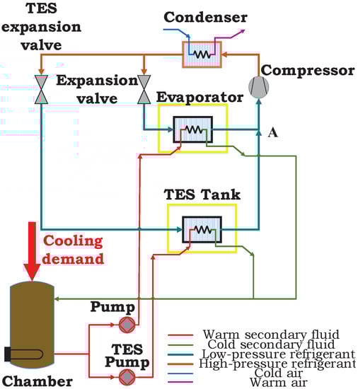 Layout of the refrigeration system with cold-energy storage. (TES denotes thermal energy storage).