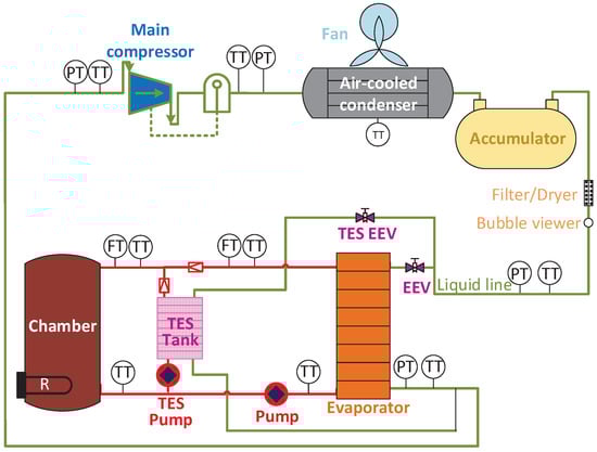 Two bundles of pipes run through the TES tank, corresponding to the refrigerant and the secondary fluid, respectively. An additional expansion valve is added to drive the refrigerant from the condenser (labelled as TES EEV in Figure 2), whereas an additional pump is needed to impulse the secondary fluid from the refrigerated chamber (labelled as TES Pump). Notice that the elements defined in [28] as the main compressor, the air condenser, the evaporator related to the refrigerated chamber at −20 °C, and the corresponding expansion valve EEV2 are considered in this configuration, whereas the TES EEV is assumed to be identical to EEV2. Further technical details about the embedding of the TES tank are described in [24].