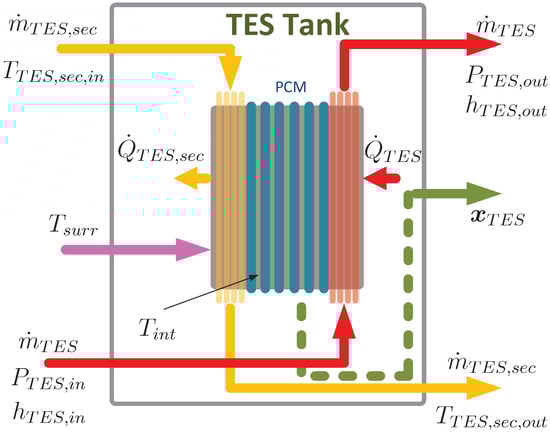 The TES tank setup is shown in Figure 3, where the relevant inputs, outputs, and states are highlighted. A number of steel cylinders enclose the PCM, while two bundles of pipes distribute the refrigerant and secondary fluid streams in a counter-current configuration, in such a way that homogeneous heat transfer is achieved. The intermediate fluid (featuring high thermal conductivity and low heat capacity) bathes all cylinders and pipes to homogenise heat transfer.