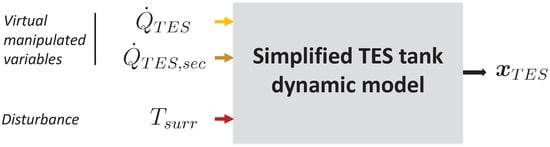 Concerning the slower time scale, since the refrigeration cycle intrinsic dynamics become negligible, the whole TES-backed-up vapour-compression cycle can be statically modelled. Then, the intermediate fluid and its heat transfer to the PCM cylinders represent the dominant dynamics. As a consequence, in the simplified model, the TES tank charging and discharging cooling powers are considered as virtual manipulated inputs, whereas the refrigeration cycle is implicit and supposed to somehow provide these cooling powers, within some feasible ranges. The simplified model is schematically described in Figure 4, where the surroundings temperature is considered as a measurable disturbance.