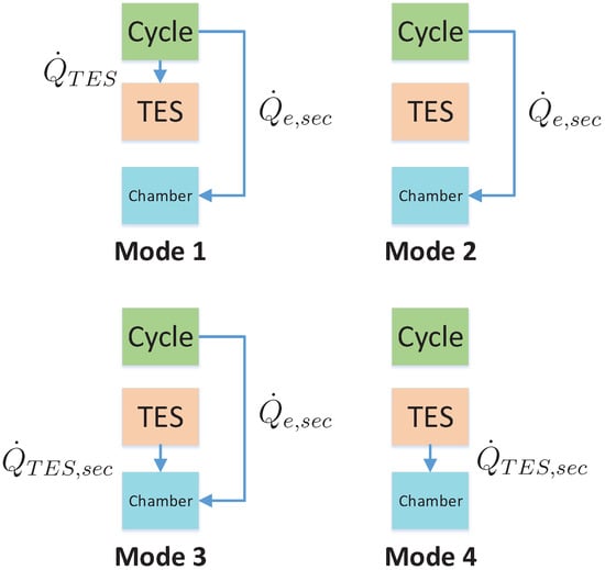 Diverse operating modes can be defined, according to all possible combinations of the three main cooling powers involved in the problem: the cooling power provided to the secondary fluid at the evaporator , the TES charging cooling power , and the TES discharging cooling power [25]. Up to eight operating modes have been defined and discussed in the aforementioned work, though the most useful operating modes might be modes 1 to 4, since modes 5 and 8 require no cooling demand, whereas modes 6 and 7 involve simultaneous TES tank charging and discharging, which may not make sense from the operating point of view. The most interesting operating modes are graphically described in Figure 5.
