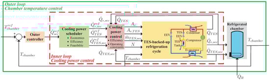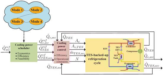 Given a certain demand , the scheduler is intended to compute the references of the three cooling powers involved: , , and , according to efficiency, economic, and feasibility criteria. The cooling power controller is then responsible for getting the TES-backed-up refrigeration system to actually provide the three required cooling powers by manipulating the four manipulated variables available, namely, the compressor speed N, both expansion valve openings and , and the TES pump. In Figure 6, the secondary mass flow that circulates through the TES tank is considered as a virtual manipulated variable, while the actual one is the TES pump speed/power. Anyway, for a certain required value of , a simple regulator is intended to drive the TES pump to actually provide the desired secondary mass flow.